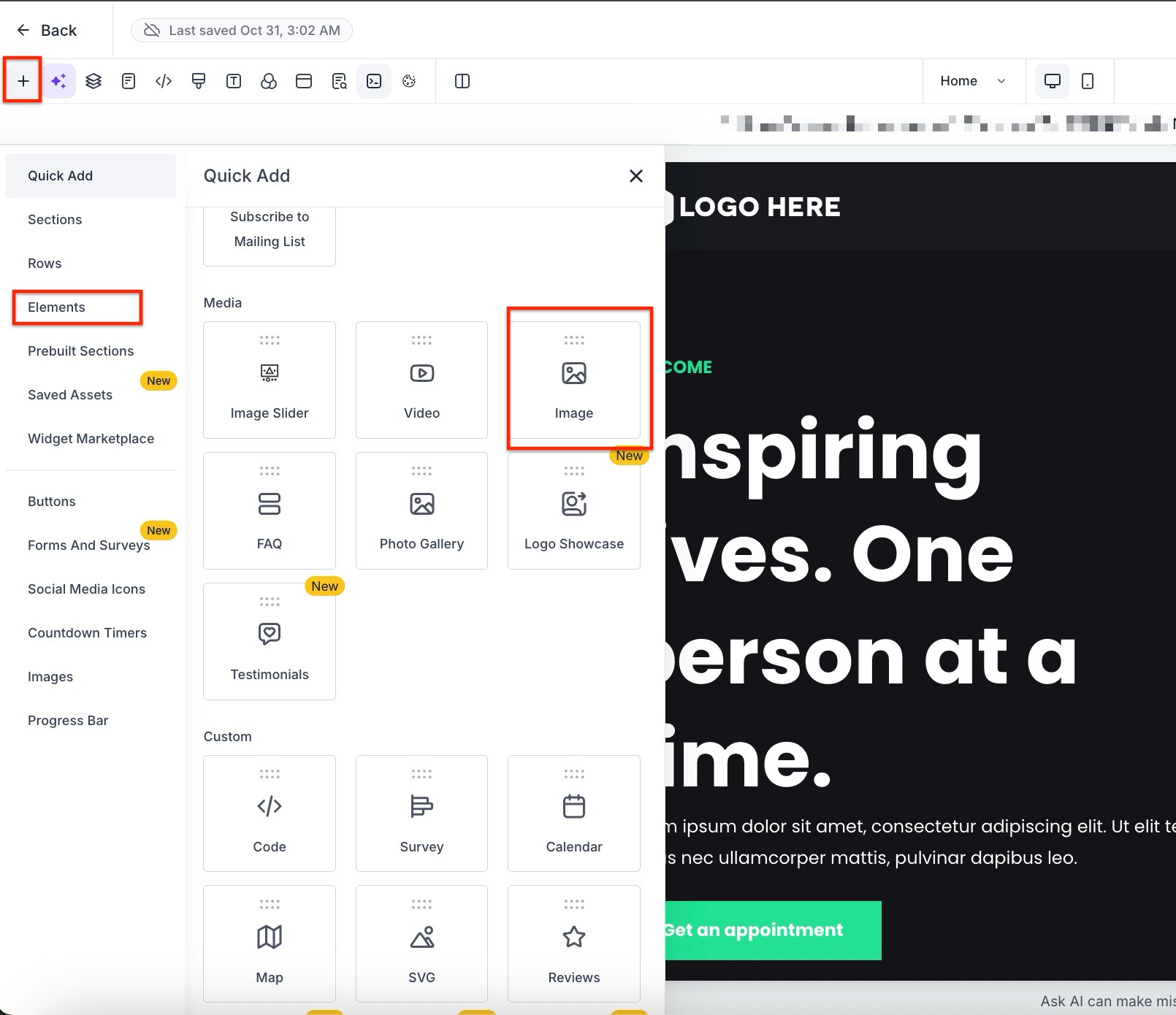 - Select or add the image or button you wish to animate within the builder.