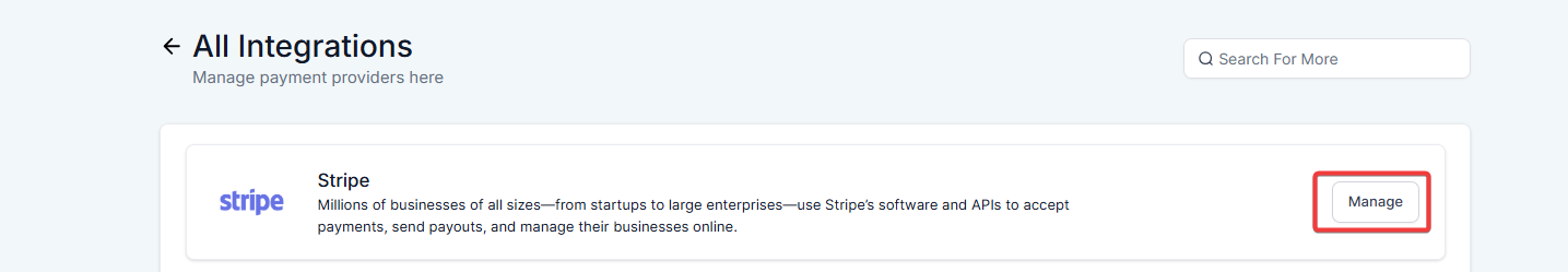- Navigate to Payments on the left > Integrations at the top. Locate Stripe and click on Manage.