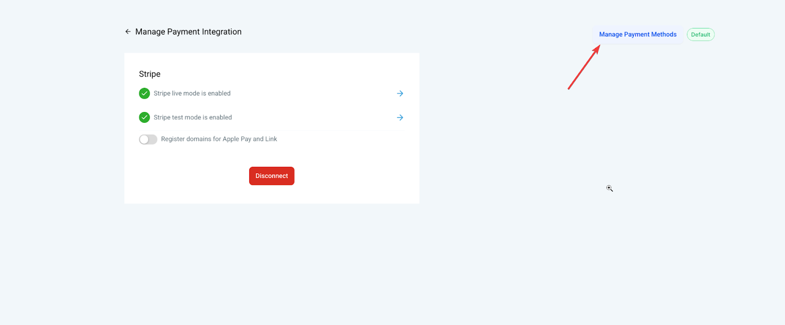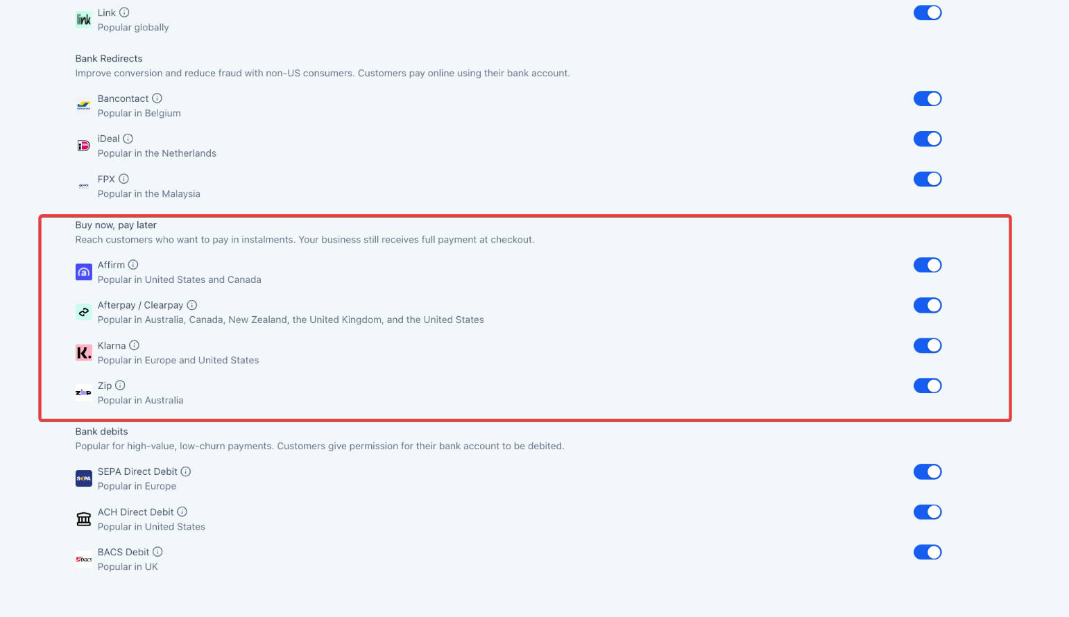Section titled “Configuring BNPL Payment Methods within”Businesses can set up Stripe payment methods directly within , eliminating the need to configure them on Stripe’s dashboard. These payment methods can be enabled or disabled for various product areas, separately in both Live and Test modes. For existing customers, the default payment methods for product areas or checkouts will remain as they were configured in Stripe.