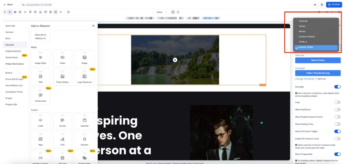 - Deciding the settings you would like to use for the Video Element is important. There are options within the settings for Autoplay and Controls depending on Video Type. Depending on the funnel, you’ll want to try different Video Element functions.