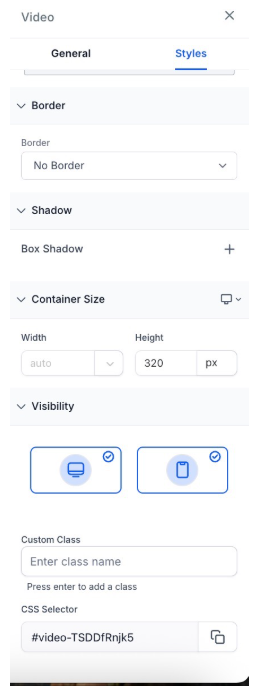 Question: What are the styles settings available for videos in the Funnel Builder? Answer: In the Styles Video Settings, you can customize the video’s border, adjust the display settings for mobile and desktop, and use the CSS selector for additional styling options.