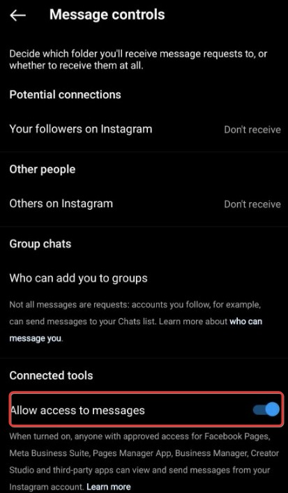 - If you toggle on, anyone with approved access to your Facebook Business Suite, Creator Studio, or other connected third-party apps can view or manage your Instagram Direct Messages.