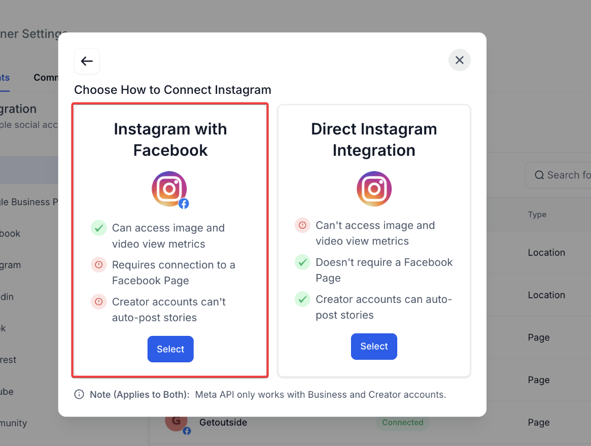 Section titled “Step 3: Connect Your Instagram Profile to the Social Planner Tool”Method 1: Instagram with Facebook (Classic Method)