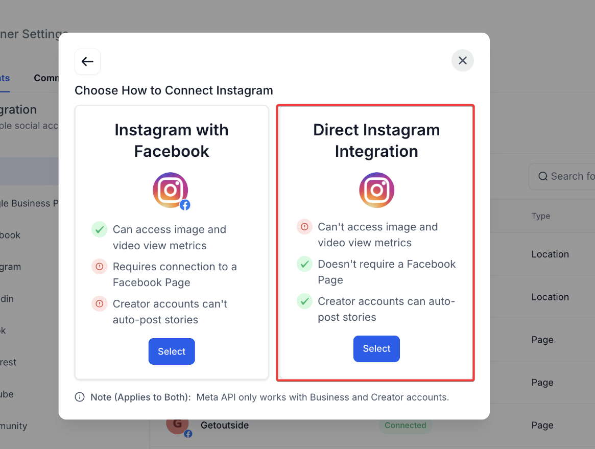 Connecting Instagram to Social Planner: Facebook-Linked vs. Direct Instagram Integration