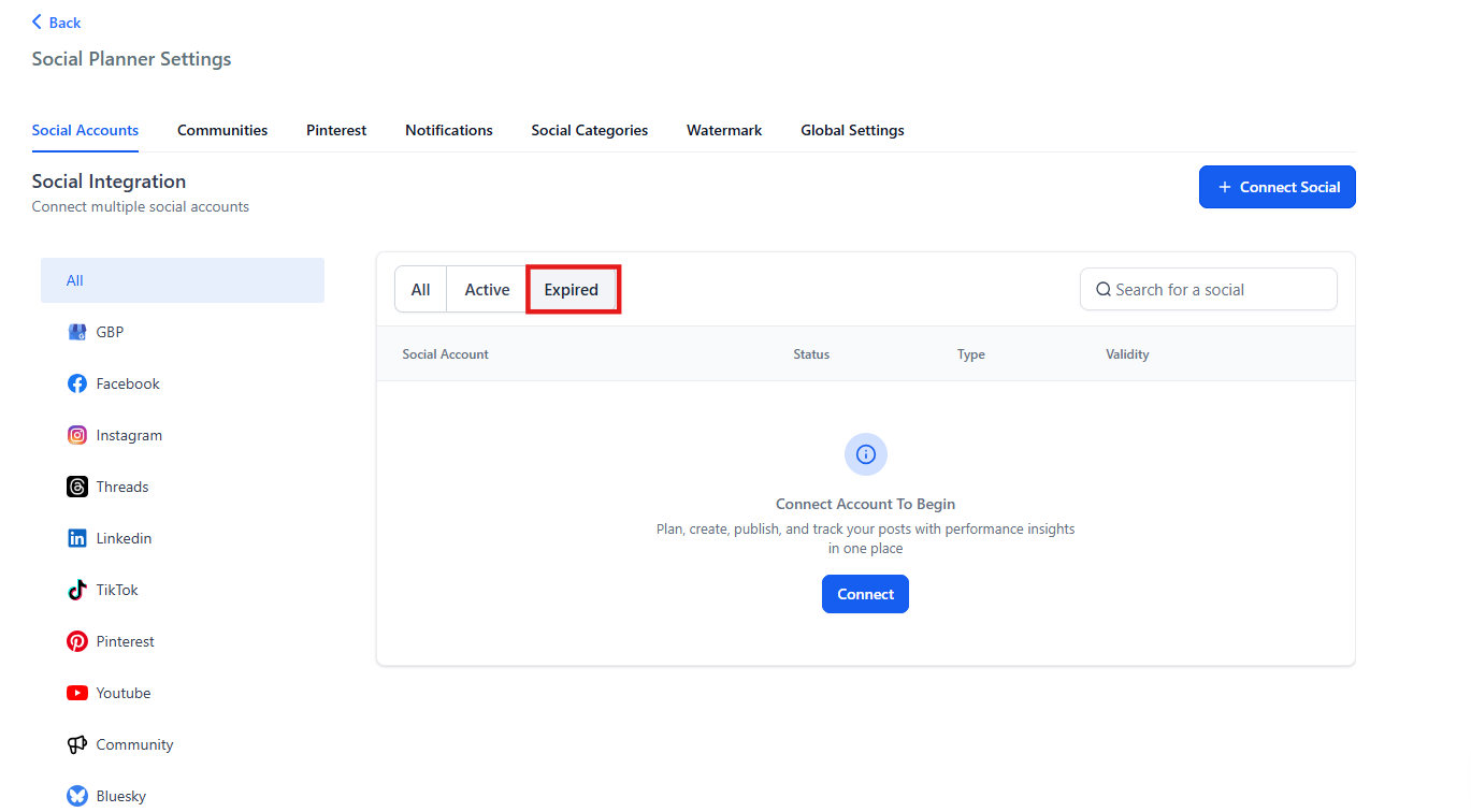 To reconnect a page or group within the Social Planner, use the same user account that originally connected it. If the account has expired tokens, follow these steps: