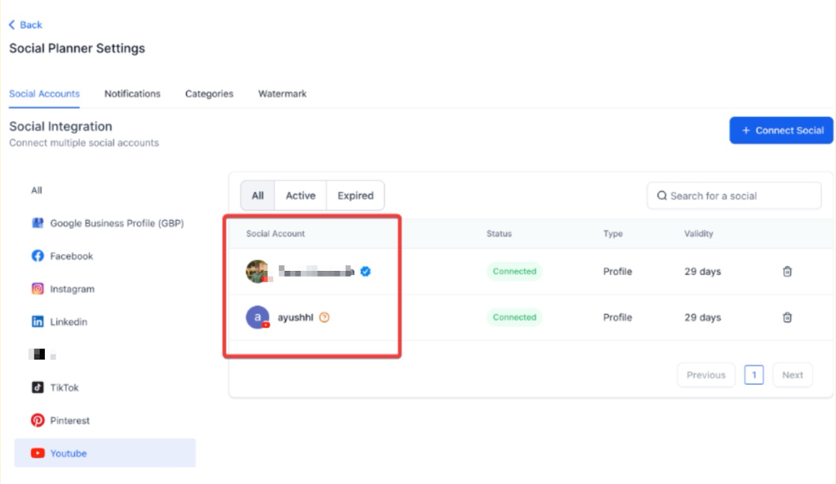 - After selecting your account, confirm the connection. You should now see your YouTube account listed within the social planner.