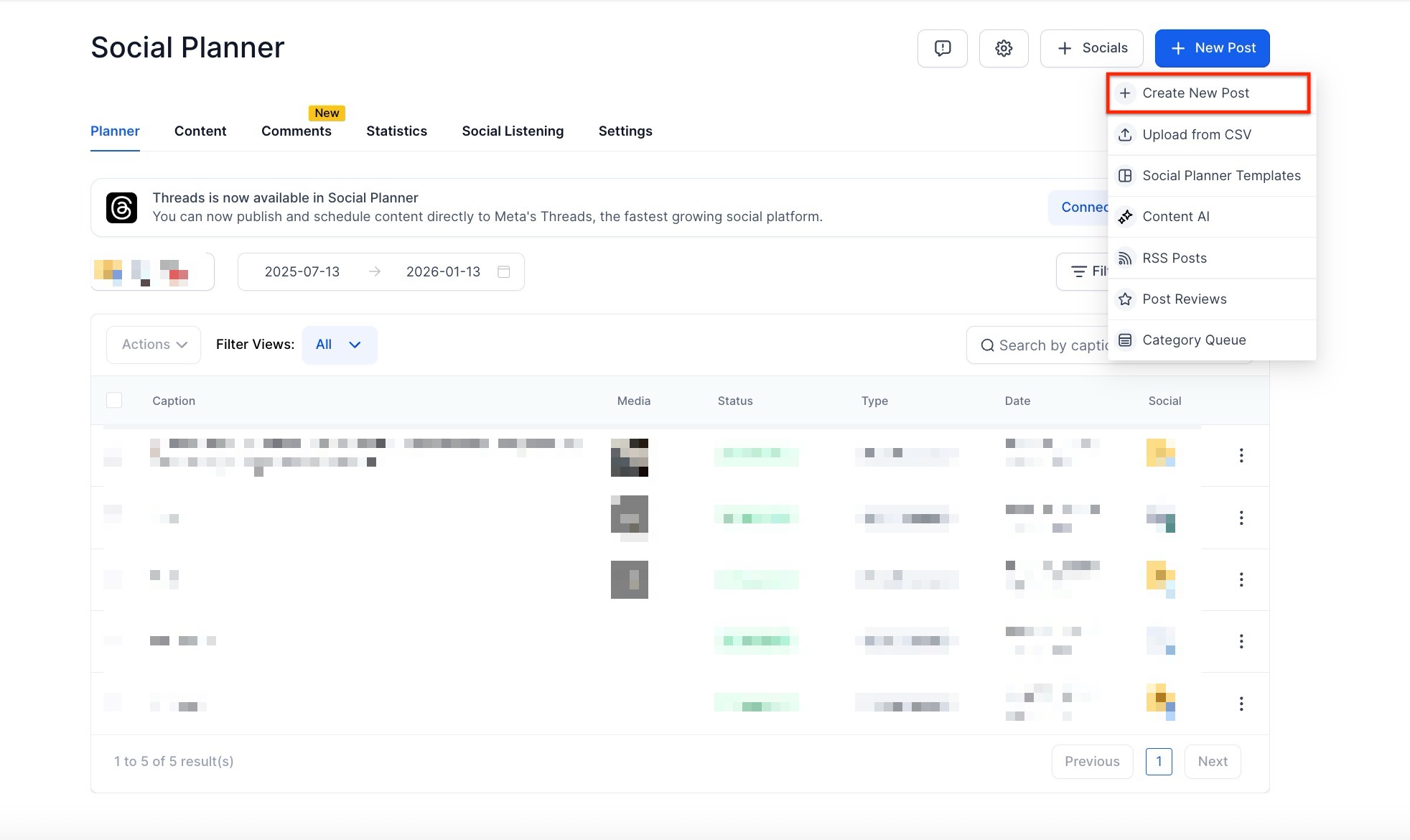 Section titled “Step 1: Go to the Social Planner”Go to the “Marketing” tab on the left > Social Planner at the top > “New Post.”