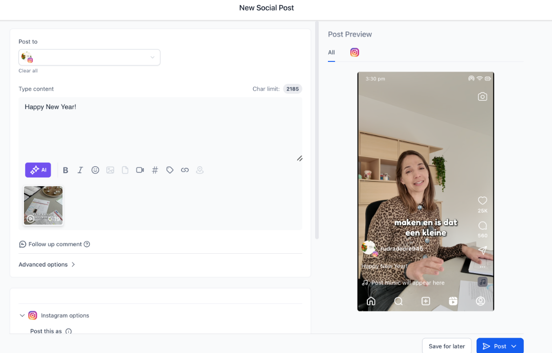 Answer: Yes, you can schedule your Instagram Reel for later publication using The Social Planner. After creating your reel, you can choose “Save for Later,” and it will be saved for future posting.