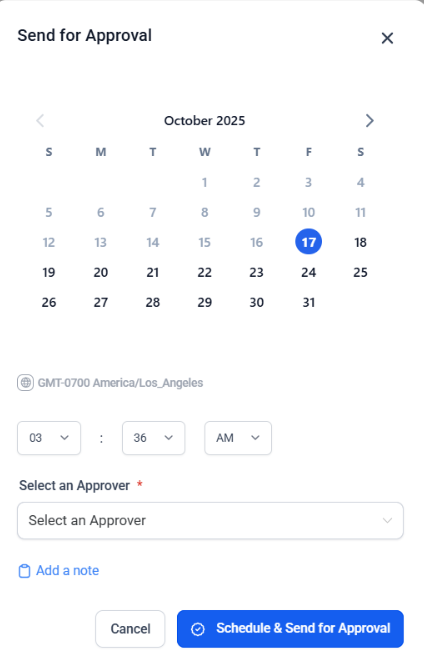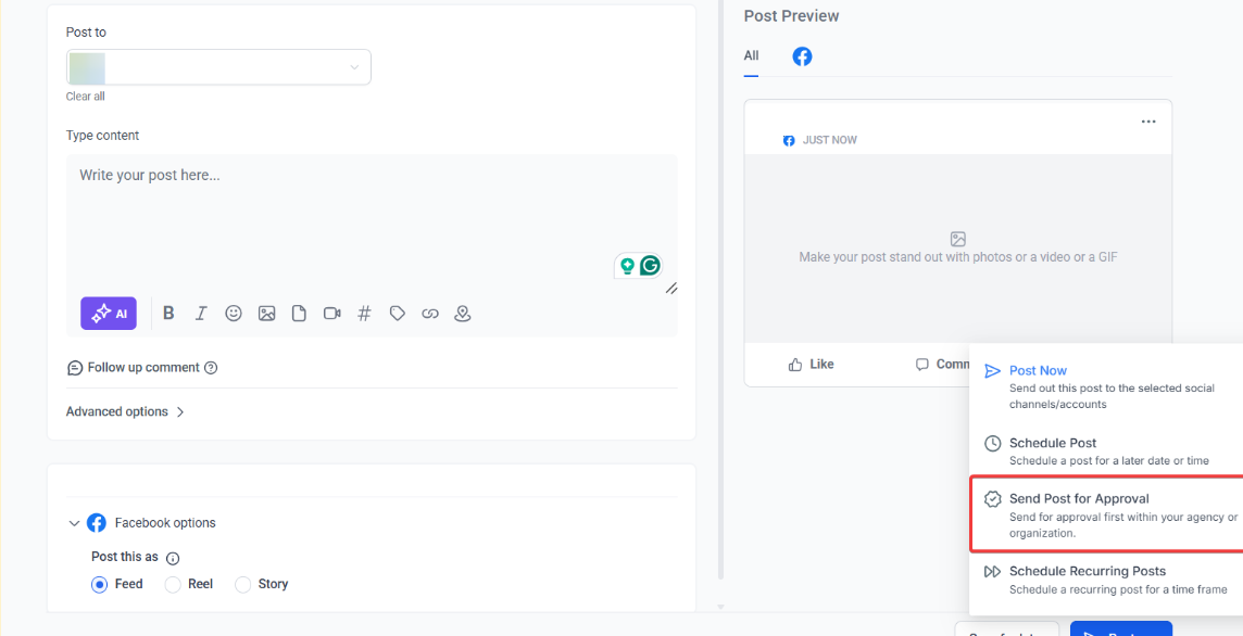 - Once the post is created with content, rich media, hashtags, and more, it can be set to “Send post for Approval”