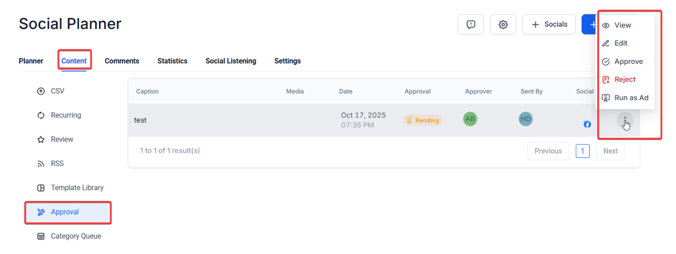 - The reviewer can see the post in the “Approval” tab with the option to view, approve or reject. The view option will allow users to view the details of posts and then approve or reject them. The reviewer team member can edit the content too for approval flow by clicking “Edit” in the view screen.