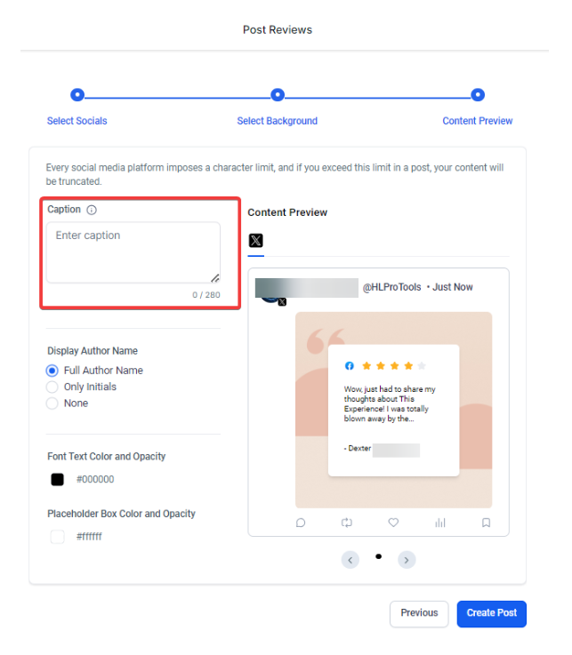 Section titled “Customization”This feature provides the flexibility to tailor your review posts to fit your brand voice and messaging. You can customize the captions to emphasize specific aspects of the reviews that align with your marketing goals.