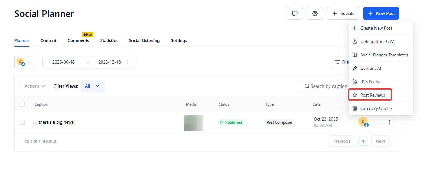 Share your Review Post on social media using Social Planner