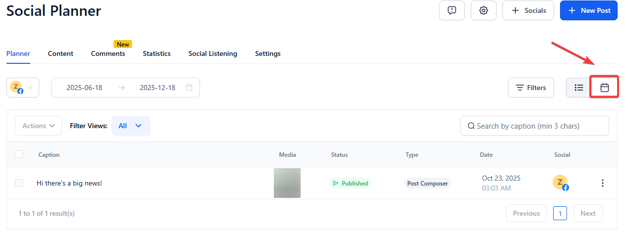 - After creating a post, it will appear in the Social Planner > Calendar View.