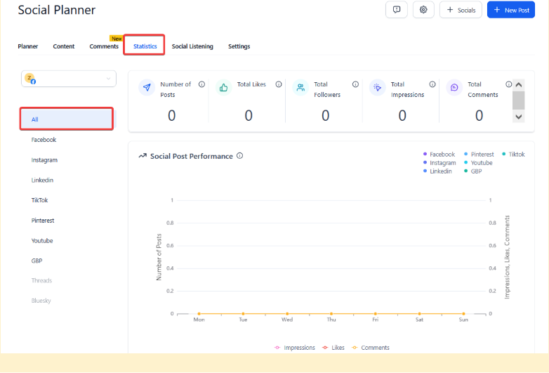 - Select Social Planner and then the Statistics tab.