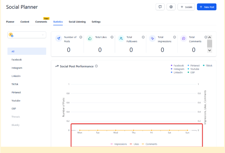 Step 6: Analyzing Weekly and Monthly Performance TrendsWhile there isn’t a date range filter in the Social Planner section, you can still monitor performance over time by using the built-in weekly and monthly comparisons available in the analytics. This allows you to understand trends and measure progress across different periods.