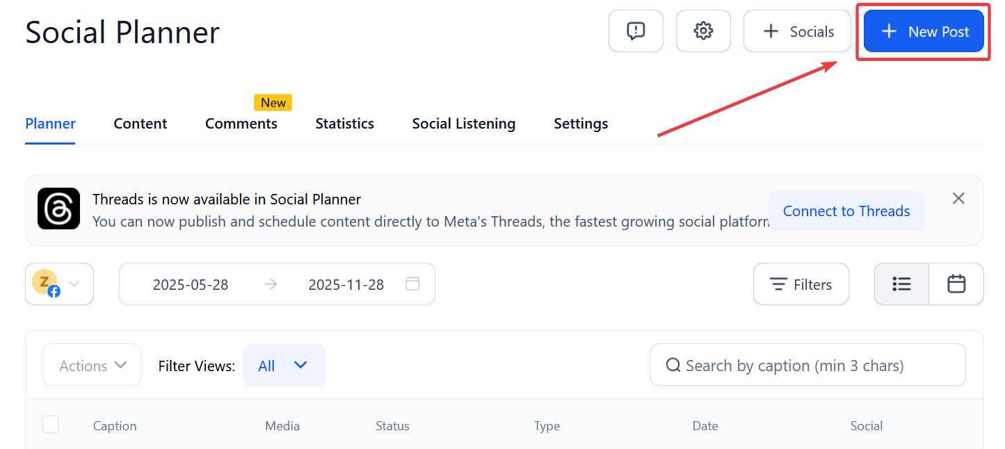 Section titled “Step 1: Prepare Your Content (Pre-requisite)”Navigate to the Marketing tab on the left> Social planner on the top right>Create a new post or edit an existing post: