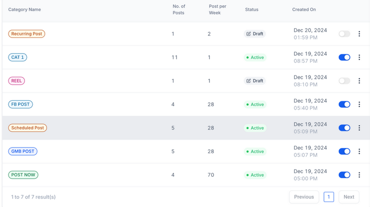 Section titled “1. Streamlined Content Organization”- Categorized Management: Group your posts into specific categories, such as Blog Posts, Tips, Promotions, or Announcements, for tailored scheduling and easy management.