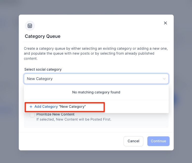 Section titled “Step 3: Select a Category”Select or create a new category on the first screen via the dropdown. Choose the relevant category for which you want to create a queue. For example, you can have categories like “Promotions” or “Tips.”