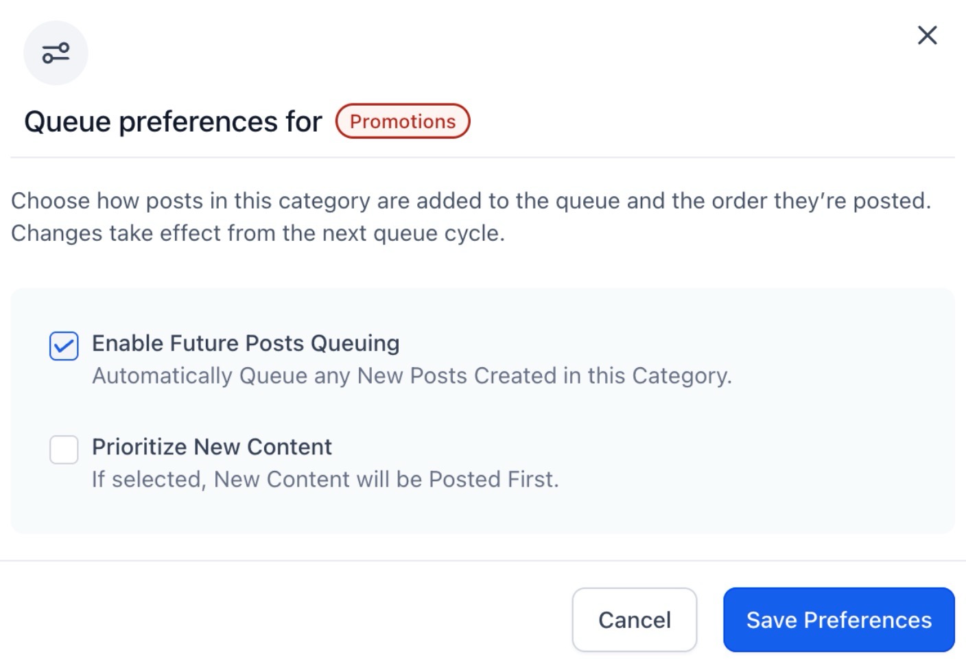 - Prioritize Content: When checked, new content is added to the top of the queue; when unchecked, it is appended to the end.