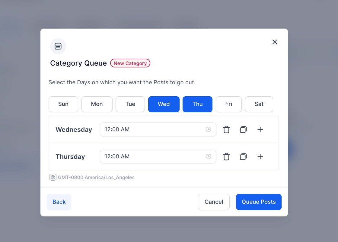 Section titled “2. Optimized Scheduling”- Targeted Timing: Assign specific posting days and times to each category, ensuring your audience sees the right content at the right moment.