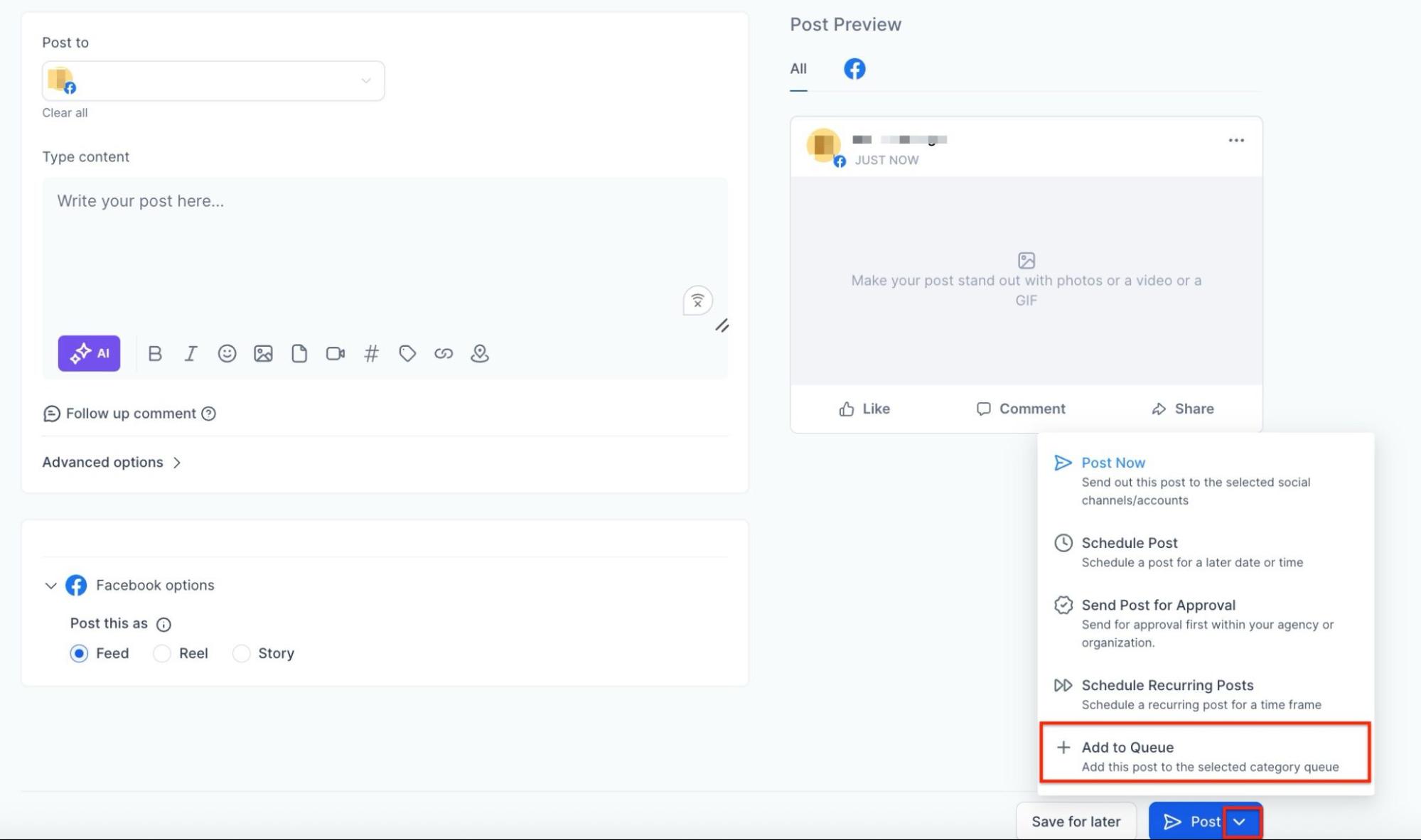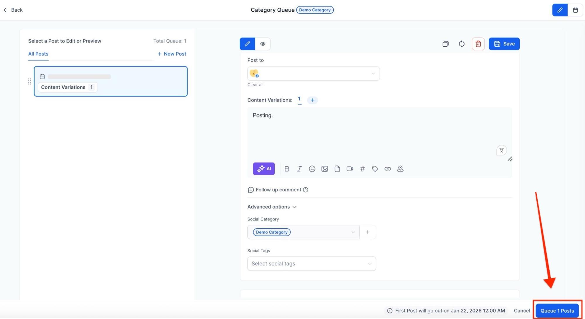 Section titled “Step 7: Finalize the Queue”- Click Queue Post to schedule posts or save them as drafts for future editing.
