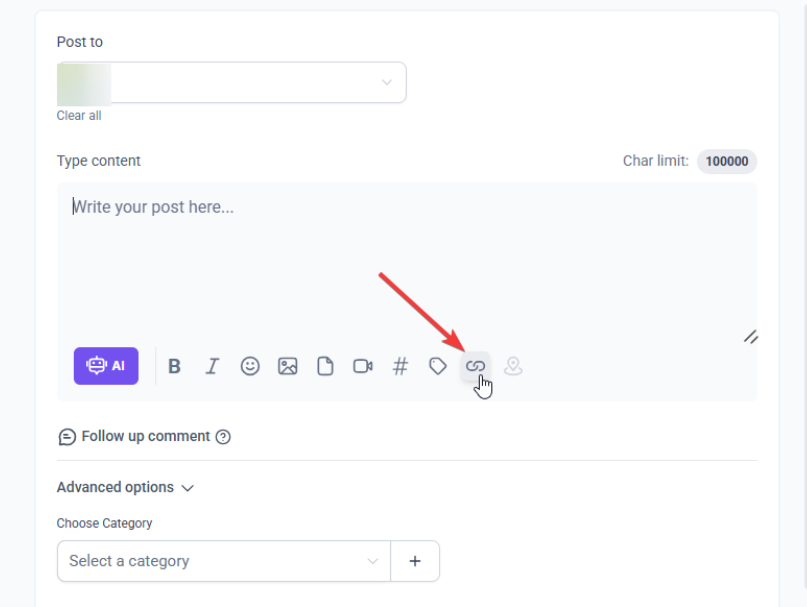 - In the post composition section, click on the link icon to access the Link Shortener.