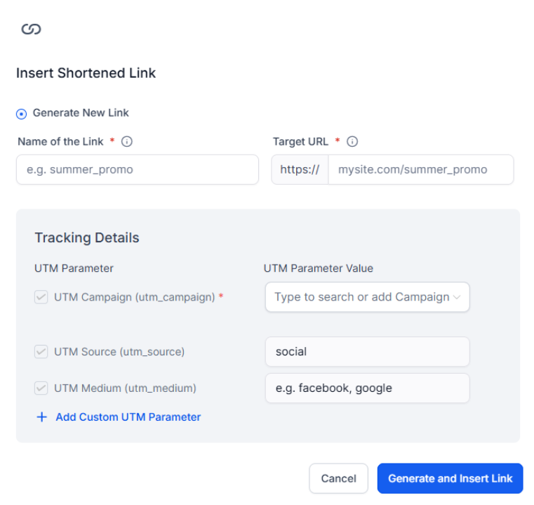 - Enter the name of your link, the target URL (the long URL you want to shorten), and any custom parameters you want to include.