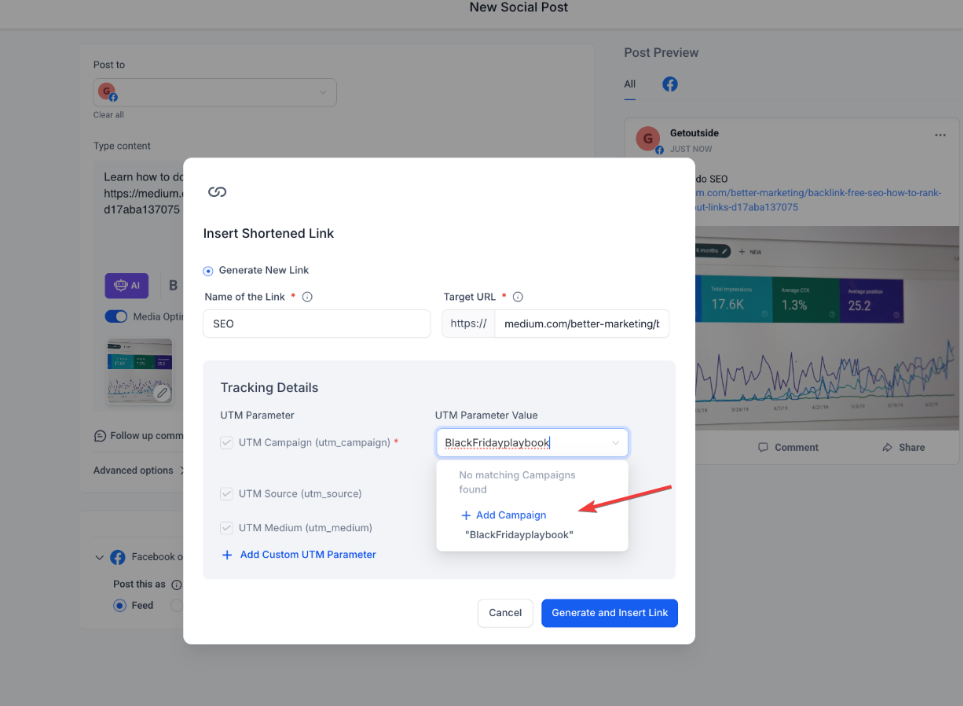 Answer: To enable tracking, you should create or select a new campaign in the link shortener settings before inserting the link into your post. This allows the system to monitor clicks and provide engagement insights.