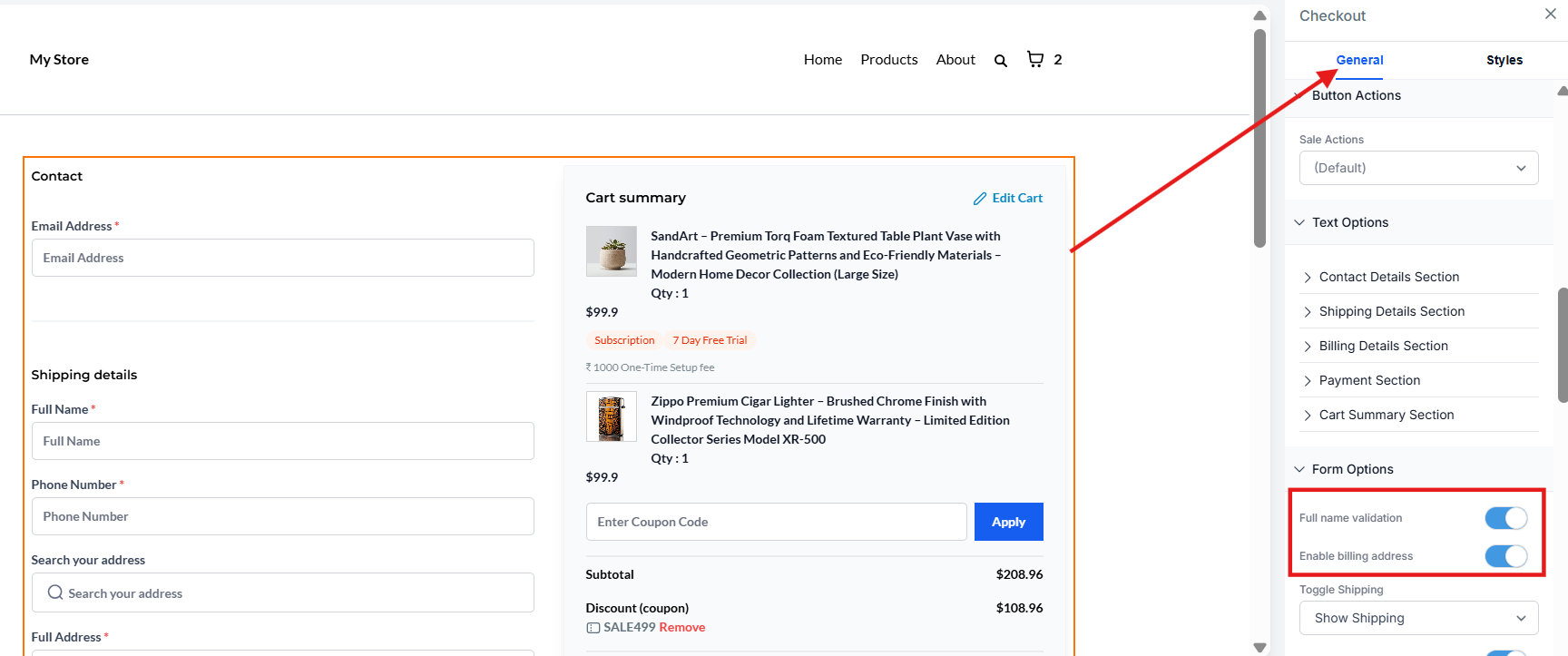 Section titled “Key Features:”- Enable/Disable Billing Address: Store owners can easily toggle the “Enable Billing Address” option in checkout settings.