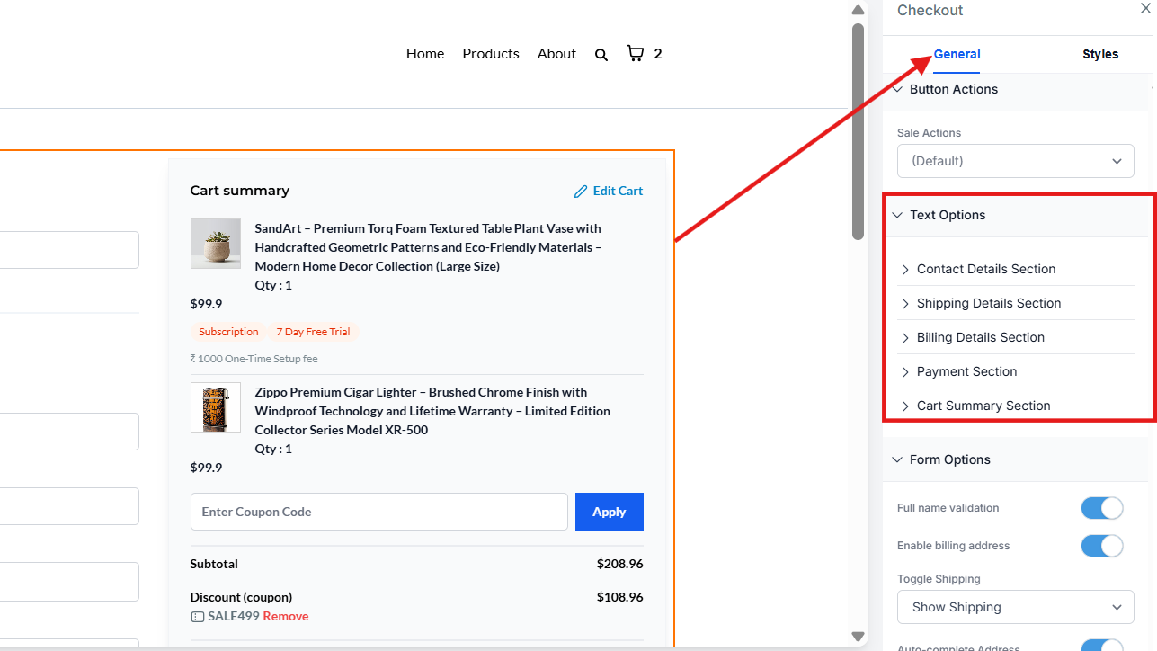 4- Customize Text: Under Text Options in General Settings, customize the billing address headline and checkbox text.