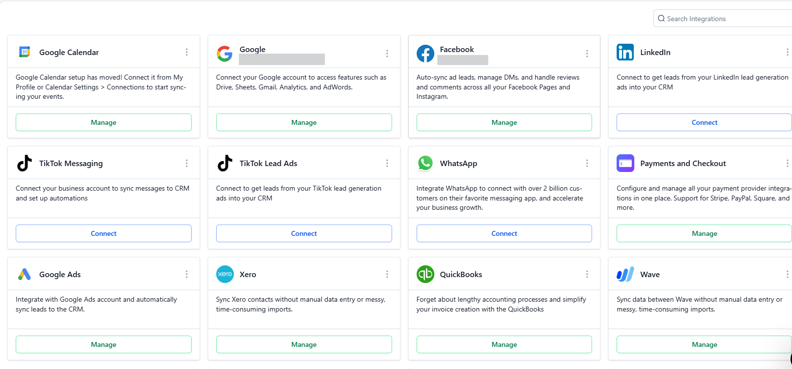 Section titled “5. Reconnect if Previously Connected:”- Disconnect and reconnect the integration, ensuring the LeadConnector integration is also removed on Facebook’s side under Facebook Profile > settings & privacy > Settings > Search for “business integrations”.