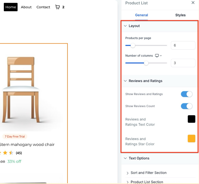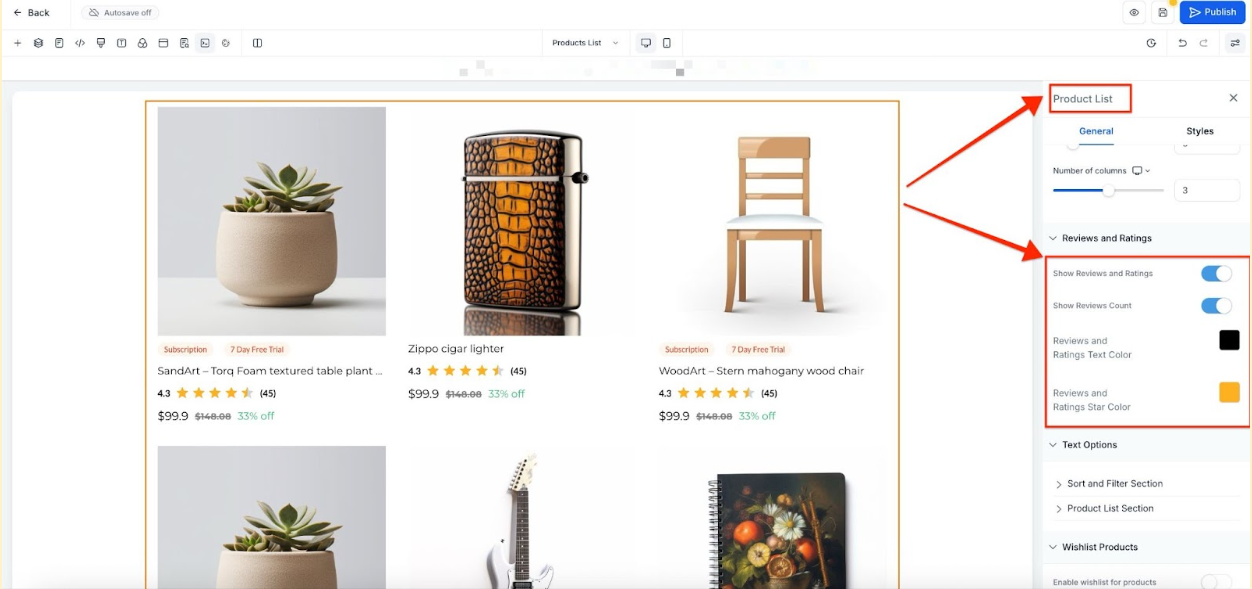 - In the builder, toggle Show Reviews and Ratings to activate review and rating visibility on both the Product Details and Product List pages.
