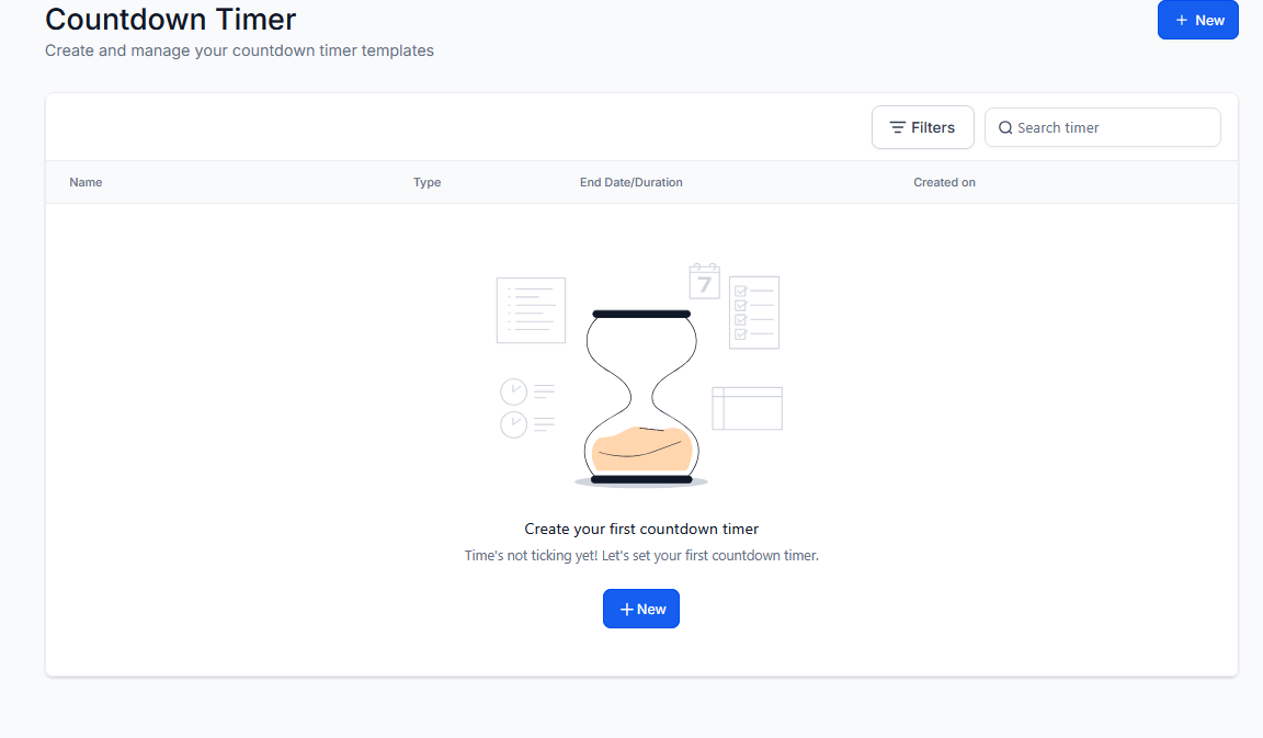 Section titled “Step 2: Create a New Timer”Click on the “New” button to start creating your timer.