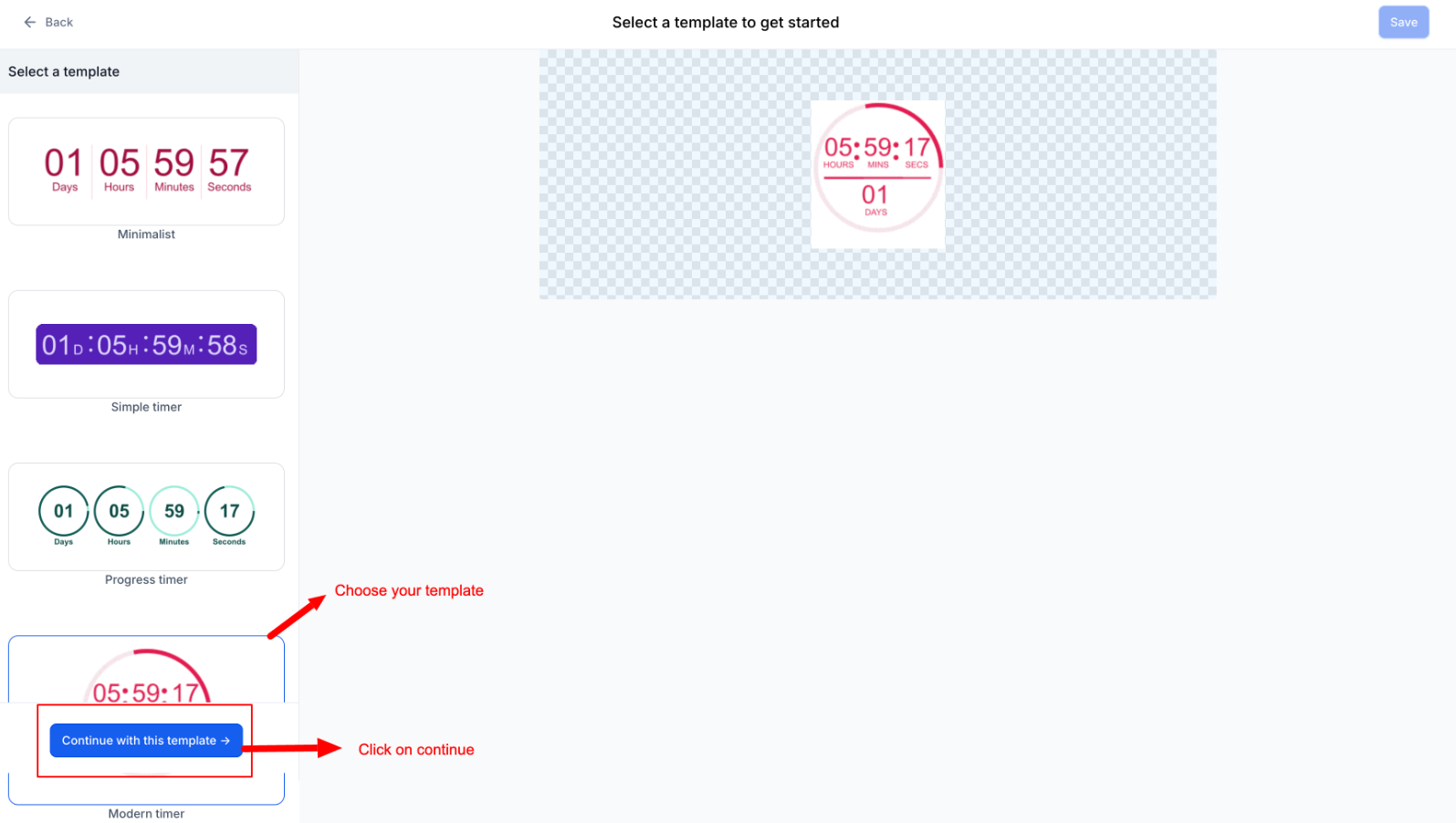Section titled “Step 3: Choose a Template”Select a design template for your timer. You can customize the design later, so pick the one that best fits your needs and click “Continue with this template.”