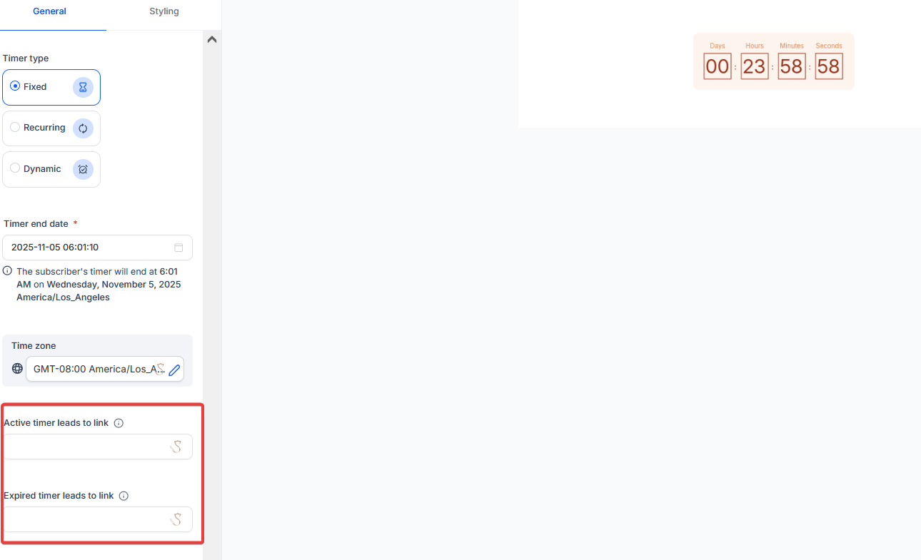 - Expired Link: Add the URL for when the timer has expired (e.g., a page indicating that the offer has ended).