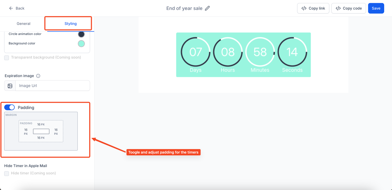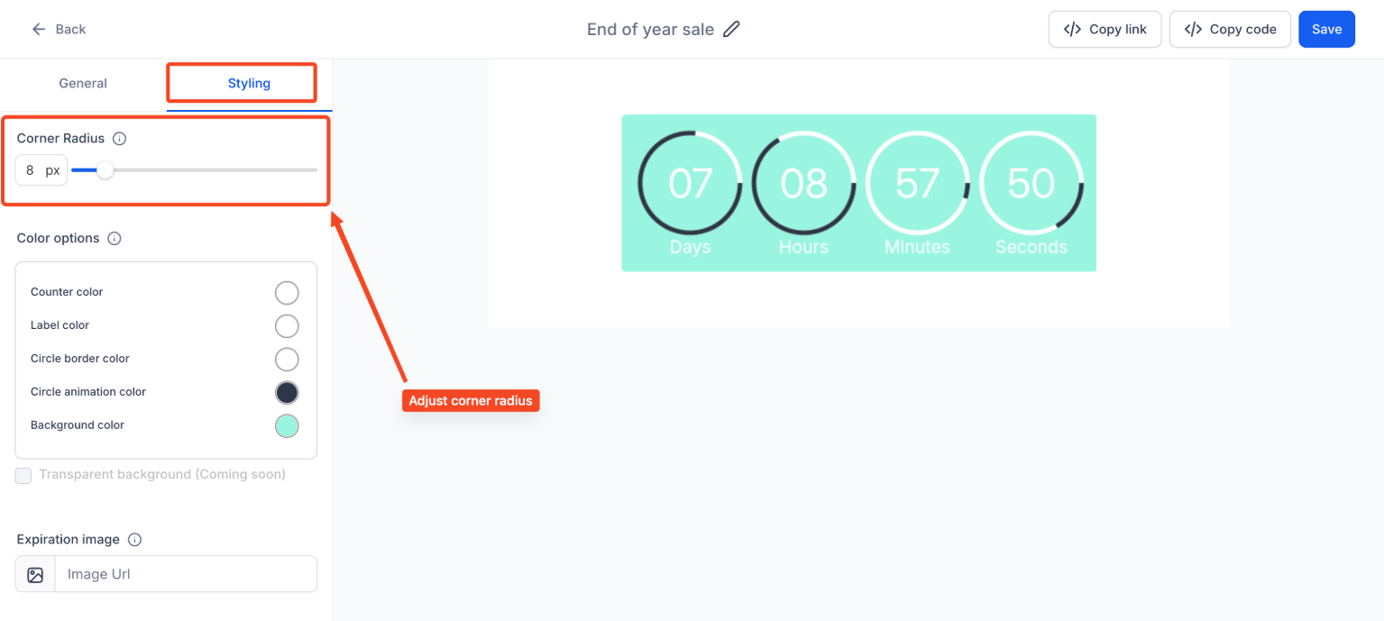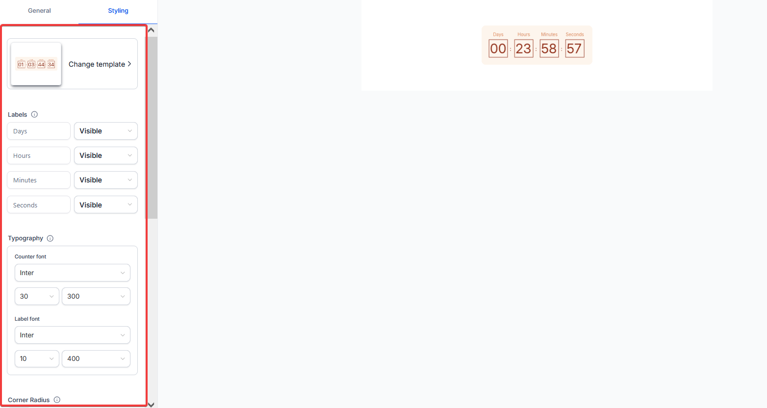 Answer: You can modify the physical appearance, such as the corner radius (to make them more rounded or square) and the padding, within the Timer Styling Settings.