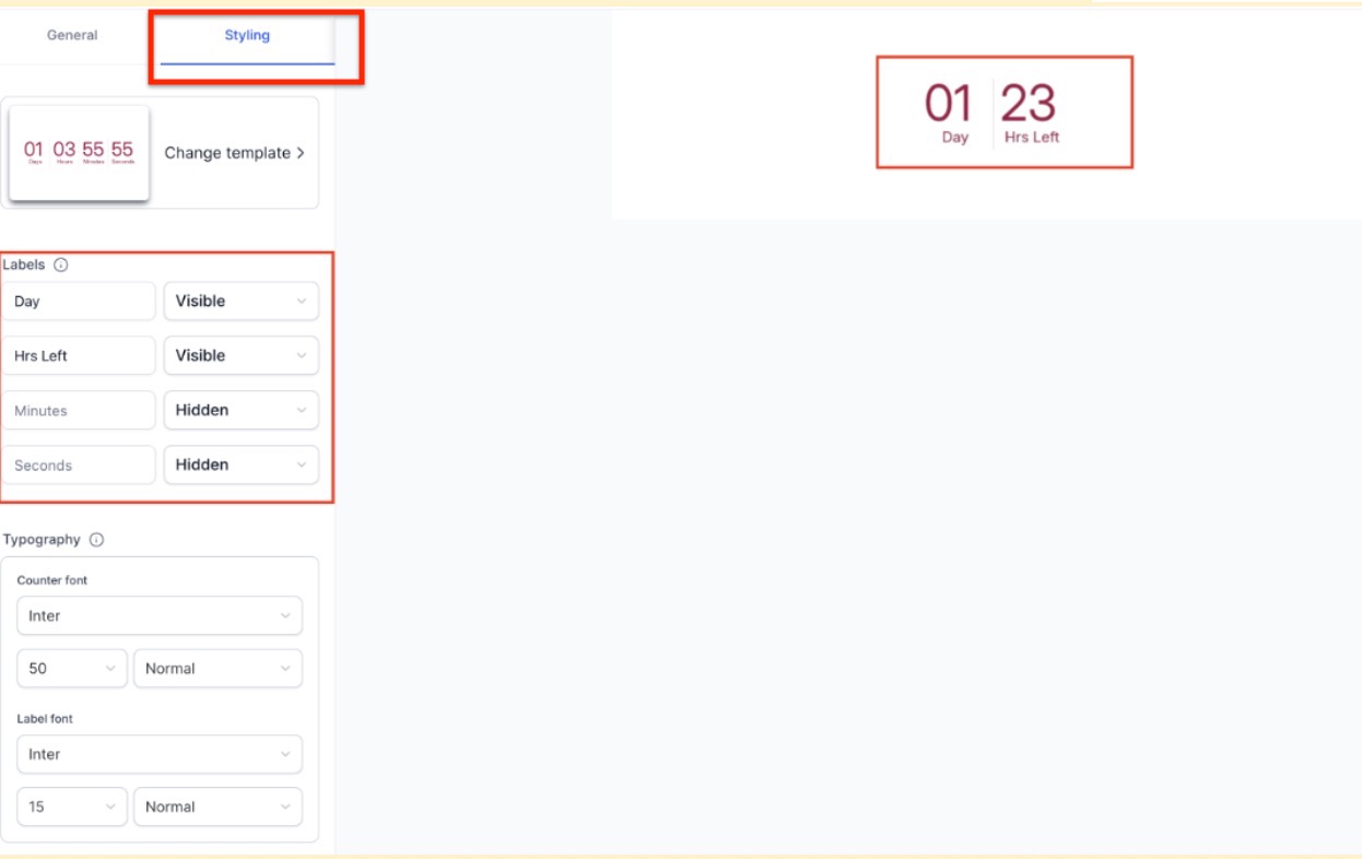 Section titled “Step 7: Customize Styling”Adjust the appearance of the timer to match your brand. You can change colors, fonts, and the format of the time display. You can also upload an expiry image that users will see when the timer ends.