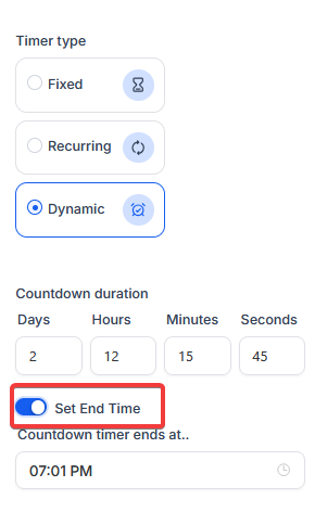 Section titled “Optional End Time for Dynamic Timer”This allows users to set a dynamic timer that ends exactly after the set duration, starting from when the email is opened or sent, providing more flexibility. This is especially useful for time-sensitive offers like discounts triggered by email opens.