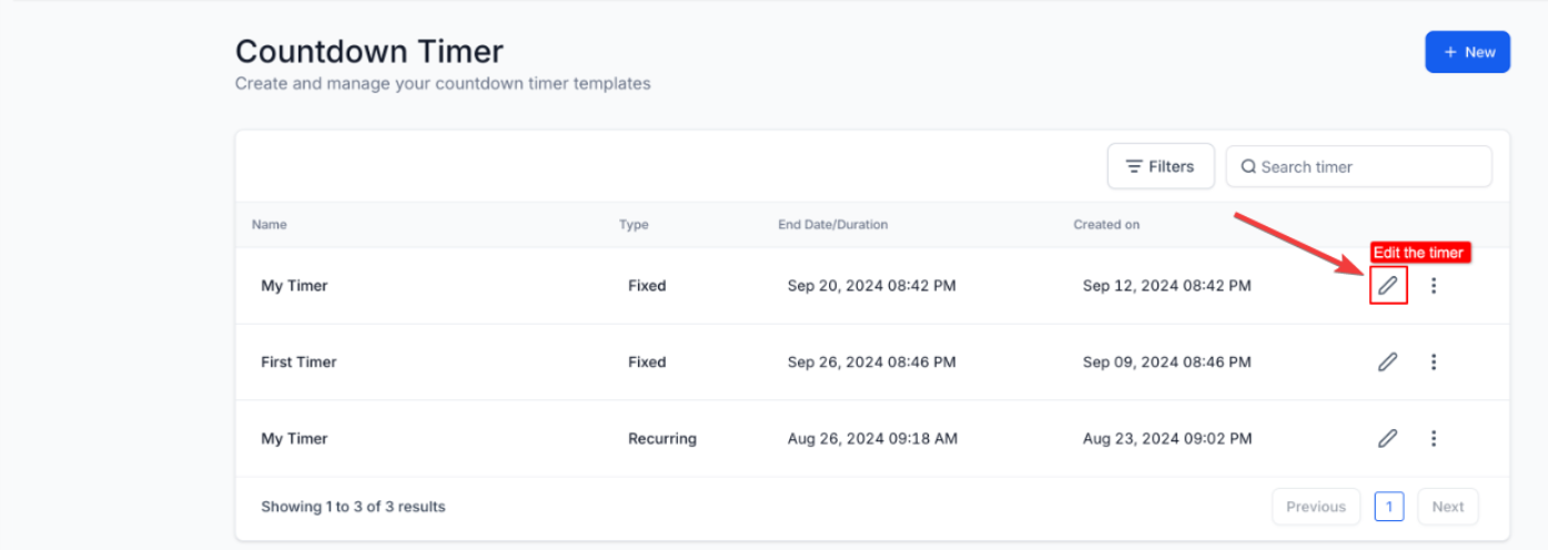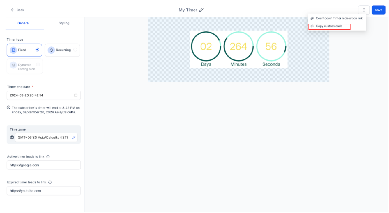 1. Copy the Timer Code: Copy the timer code either by clicking on the three dots on the list view or edit view of the timer