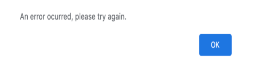 Section titled “Q. Why am I receiving an error when sending a test email, and how can I fix it?”A.When testing a campaign email, you may receive a popup notification with an error message that states “An error occurred, please try again.” The message will look like this: