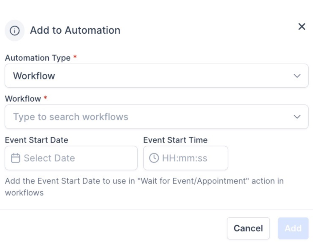 Section titled “Click the add workflow button, choose the workflow you want to test, leave the “event date” blank then hit the add button. ”