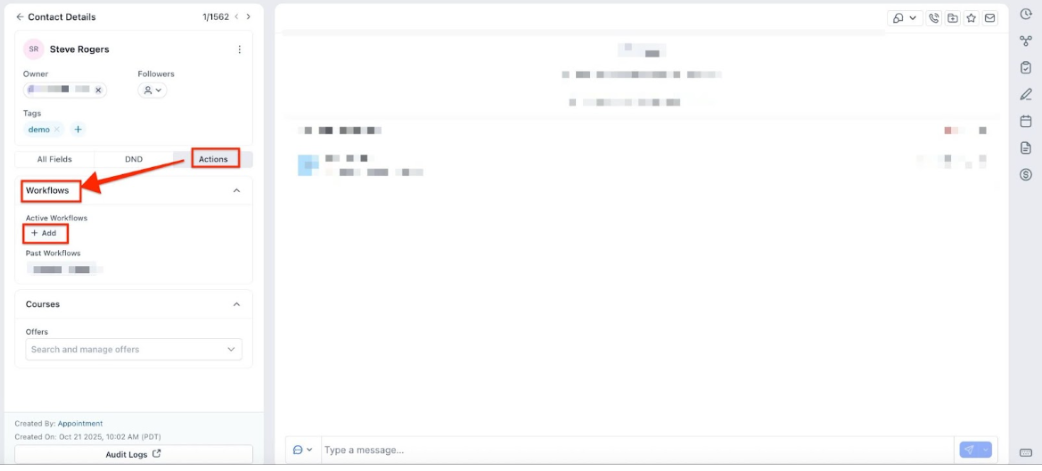 Section titled “Step 2: ”Click the + button to add the contact to the desired workflow