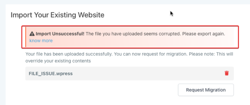 - If the plugin is from your current or a source WordPress installation, please remove this plugin and try again. If, after resolving the plugin issue, a file corruption error persists, the system will update the error message to reflect this. In such cases, deleting the corrupted file and attempting a new import is recommended.