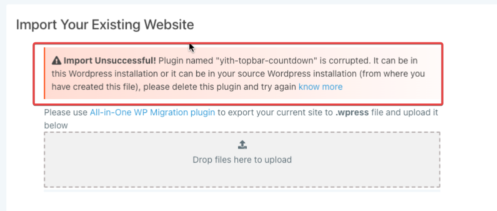 Answer: If you encounter an error message that a plugin, such as ‘yith-topbar-countdown’, is corrupted, remove the plugin from your WordPress installation and attempt to reinstall or replace it. If the plugin was originally from a source installation, ensure you remove it completely and attempt the import again.