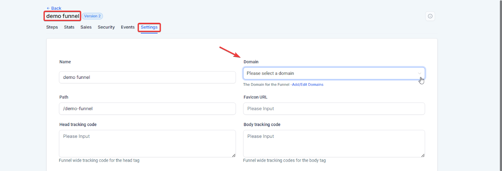 2. Go to Sites > Funnels > Select the Funnel and go to Settings (choose the funnel you want to use in WordPress). Configure the domain and save it.