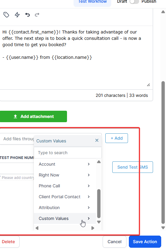 Section titled “Question: How do I attach Custom Values URLs to SMS messages?”**Answer:Attaching custom values to SMS messages is a straightforward process. Follow these steps: