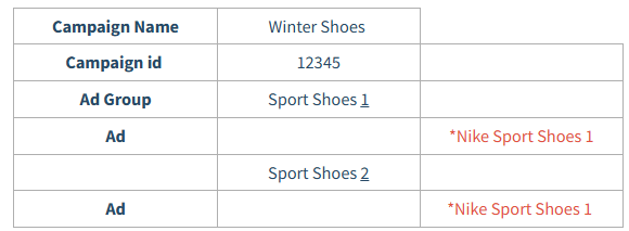- Incorrect Setup Example: Campaign Name: Winter Shoes, Ad Group: Sport Shoes 1, Ad: Nike Sport Shoes 1.