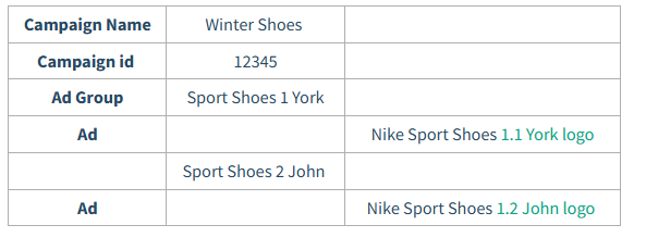 - Correct Setup Example: Campaign Name: Winter Shoes, Ad Group: Sport Shoes 1 York, Ad: Nike Sport Shoes 1.1 York logo.