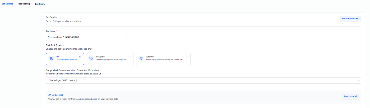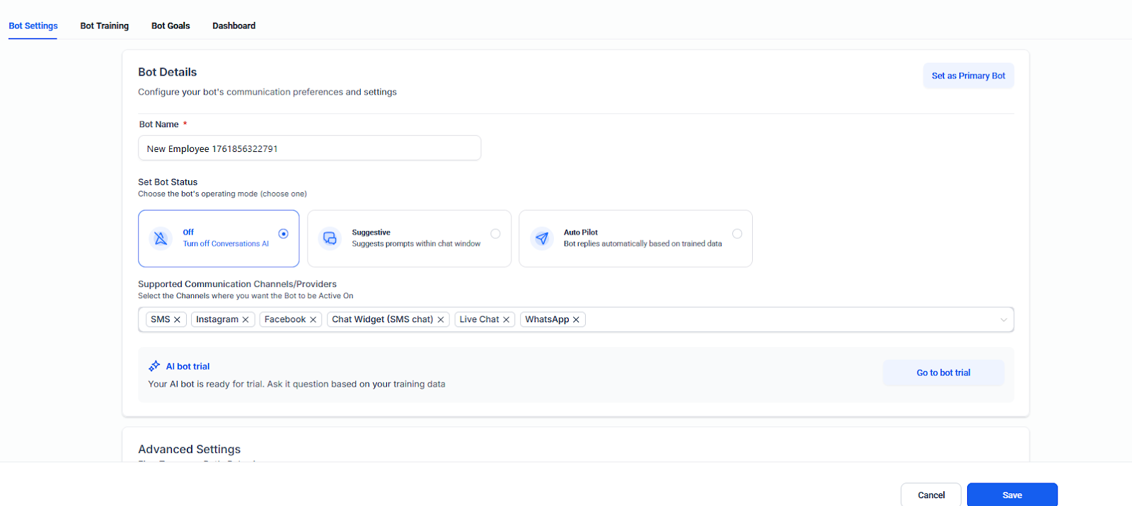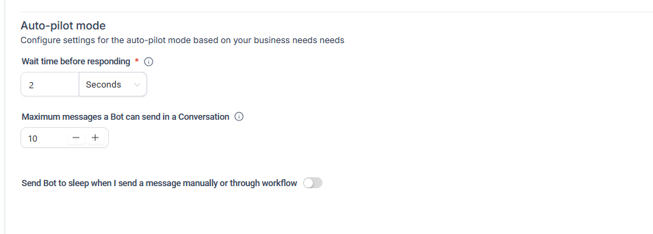 - Ensure that the bot status is set to Auto-Pilot Mode to allow the AI to respond automatically to all incoming messages without manual intervention.