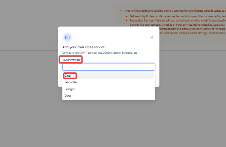 Section titled “Question: Why can’t I use my free email address (like Gmail) as the SMTP provider?”**Answer:Free email services like Gmail often have limitations when used for SMTP integrations, especially when sending a high volume of emails. These services may block or restrict your account if they detect suspicious or mass emailing activity.